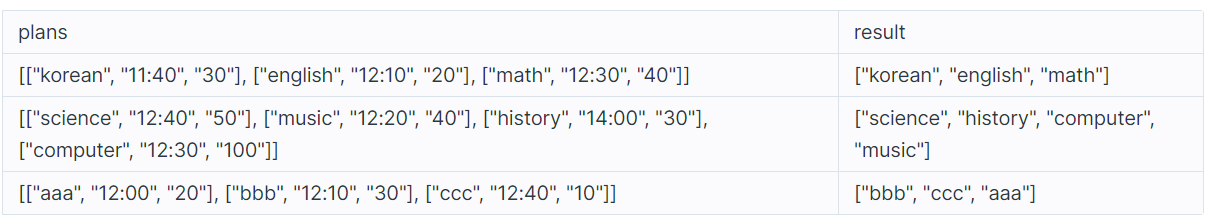 과제 계획을 담은 이차원 문자열 배열 plans가 매개변수로 주어질 때, 과제를 끝낸 순서대로 이름을 배열에 담아 return 하는 solution 함수를 완성해주세요.